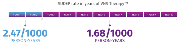 In a retrospective claims analysis, age-adjusted SUDEP rates decreased over time from years 1 to 2 (2.47/1000 person-years) to years 3 to 10 (1.68/1000 person-years).* A study on 277,661 person-years of up to 10 years of follow-up and 3689 deaths, including 632 cases of SUDEP, showed that long-term VNS Therapy is associated with lower SUDEP rates. The data suggest that SUDEP risk decreases during long-term follow-up of patients with refractory epilepsy receiving VNS Therapy.