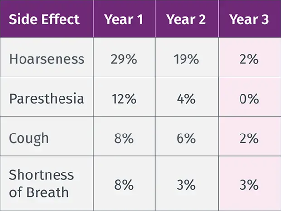 The most common side effects of VNS Therapy occur during stimulation and generally become less noticeable over time for most patients.5,7 Infection is the most common complication of the procedure.6